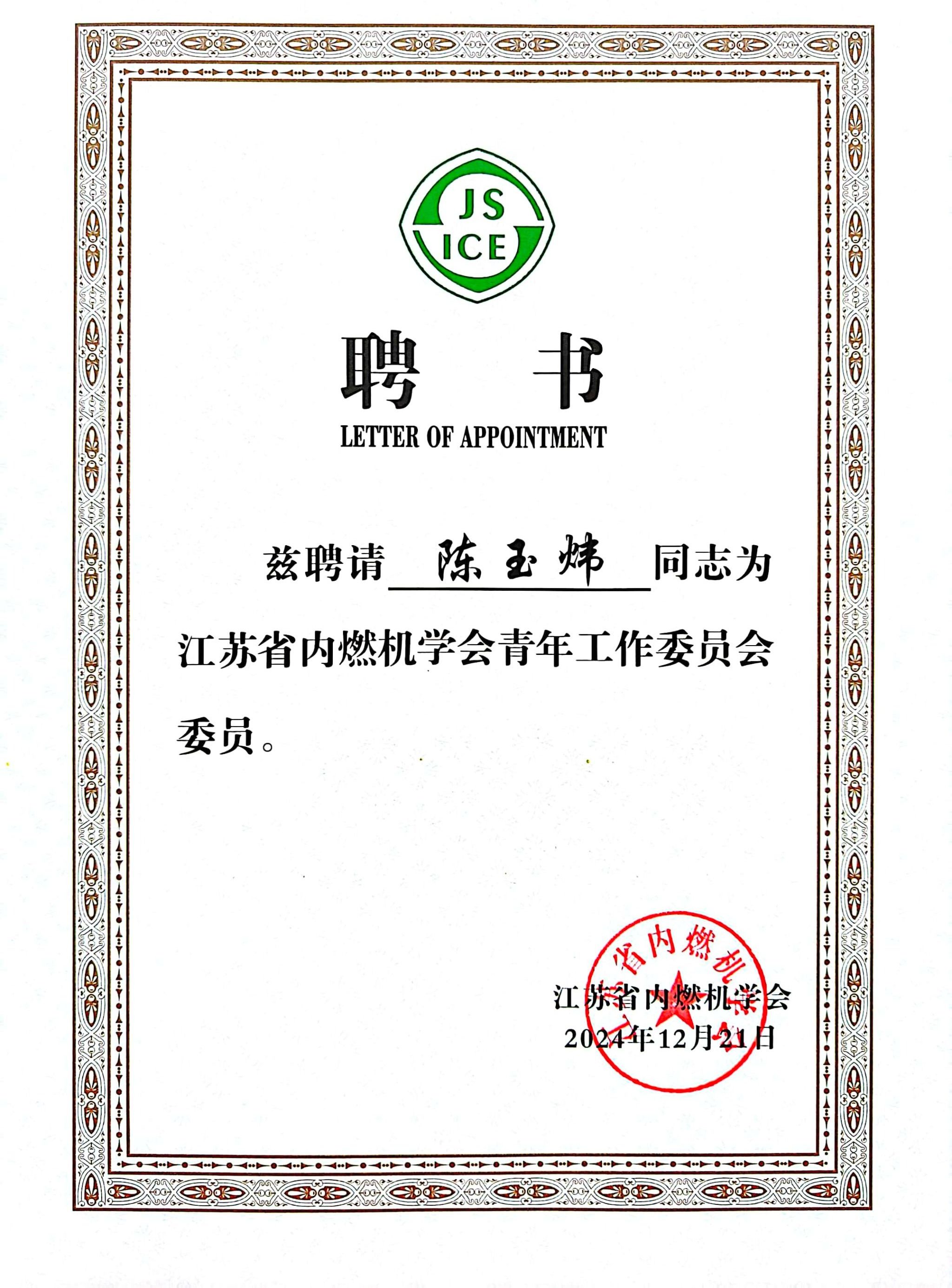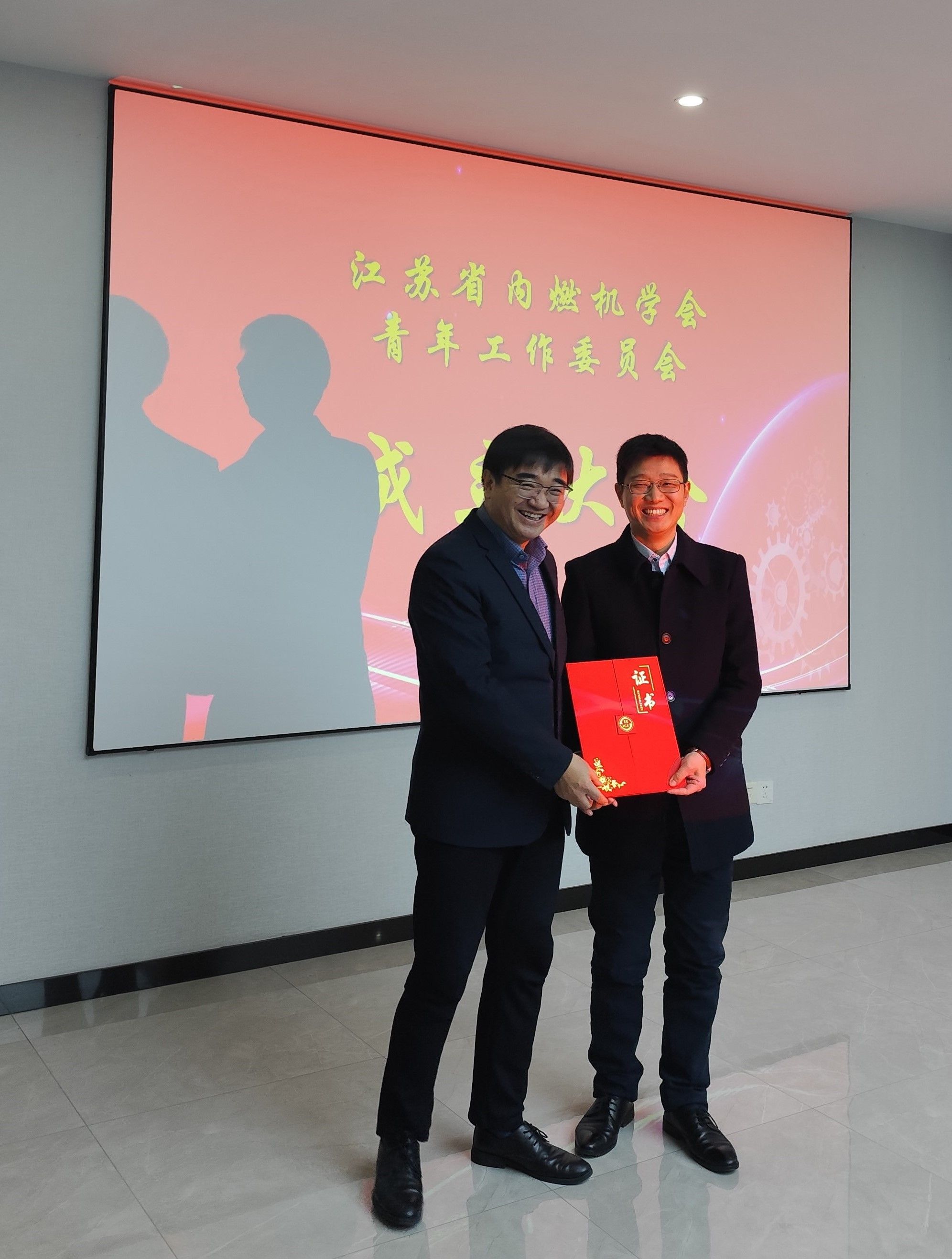 会上,江苏省内燃机学会理事长尹必峰为新一届青年工作委员会委员颁发证书。陈玉炜在发言中表示,入选江苏省内燃机学会青年委员是学会对我科研成果的认可,更是对我的鞭策激励,今后我将积极参与学会的各项活动,与各位同仁共同探索行业前沿,推动内燃机技术的创新与发展。