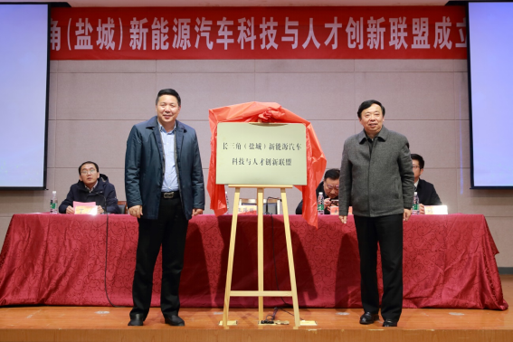 王路明和邓既明共同为长三角(盐城)新能源汽车科技与人才创新联盟揭牌。主席台嘉宾向理事长单位、秘书长单位和8家副理事长单位授牌,向5名联盟产业教授颁发聘书。8家成员单位与公司现场签约了4项产学研合作项目和4项人才培养项目。