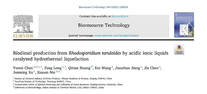 日前,生物质领域顶级期刊《Bioresource Technology》(中科院Ⅰ区Top,IF=11.889)在线出版了william威廉中文官网青年教师陈玉炜的研究论文《Biodiesel production from Rhodosporidium toruloides by acidic ionic liquids catalyzed hydrothermal liquefaction》。该研究由中国林业科学研究院林产化学工业研究所、william威廉中文官网和中国科公司大连化学物理研究所合作完成。