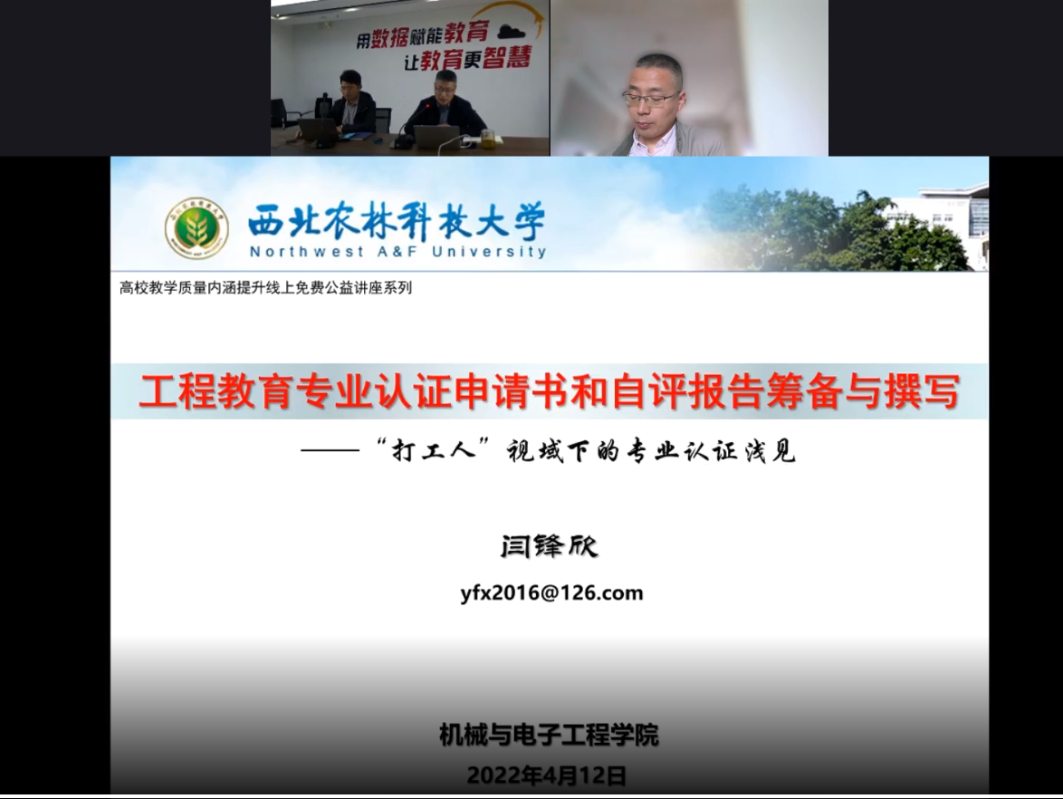 2022年4月12下午,公司车辆工程系组织全系专业教师集体在线观看“高校教学质量内涵提升线上免费公益讲座”——《工程教育专业认证申请书和自评报告筹备与撰写》。该讲座由上海商鼎软件科技有限公司主办,西北农林科技大学机电公司机械工程系副主任闫锋欣博士主讲。闫主任主要围绕四个方面展开阐述: