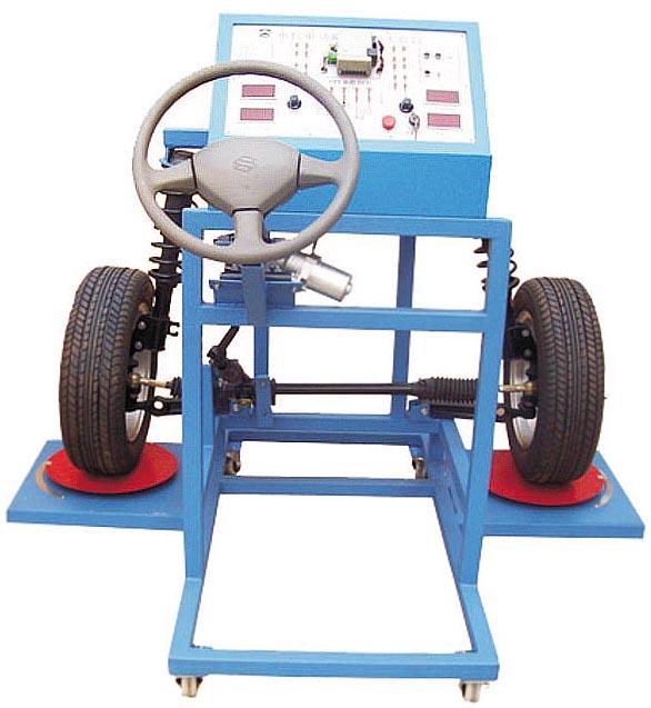 本实验台由全新主流车系电动助力转向系统实物总成组成,包括:方向盘、万向机、前悬挂系统、车轮、转角盘、控制单元、电动机、扭矩传感器、实训台支架。适用于中高等职业公司和培训机构的汽车底盘构造与维修实训教学,能够满足电动助力转向系统的结构组成,动作演示故障诊断分析等教学需求。
