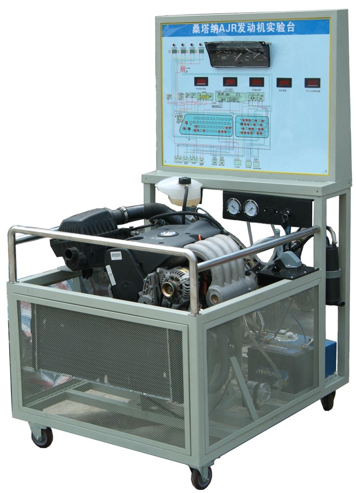 桑塔纳2000AJR发动机故障检测诊断实验台的面板设置彩色电路图与发动机控制电脑管脚一一对应的信号外接式检测区,数字显示电压表显示各传感器数据电压,指针式压力表显示真空压力和燃油压力,LED灯显示喷油脉宽,OBDⅡ检测连接座可接专用故障读取器,连接计算机读取故障,可进行故障读码解码,也可连续使用;防盗匹配,钥匙匹配等功能;可用仪器进行检测、诊断、读取数据流、匹配等操作;可移动台架,台架经过高温处理;智能故障设置控制等功能,连接计算机设置故障,可连机使用,由一台电脑控制若干台设备。