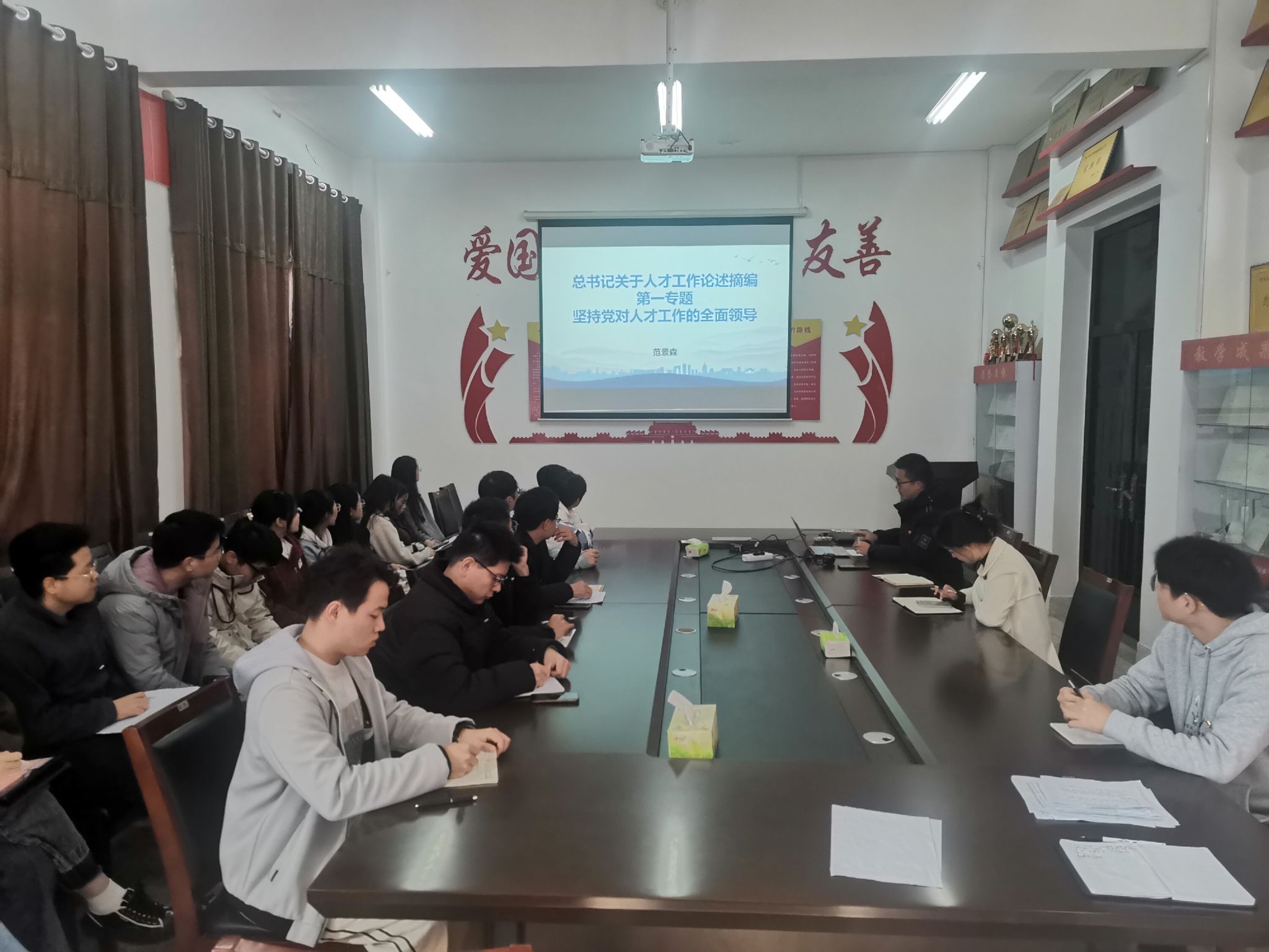 会议开始,由范景森同志就本次党课学习展开了领学。会议中,范景森同志就“总书记关于人才工作论述摘编第一专题:坚持党对人才工作的全面领导”表示,我们党始终重视培养人才、团结人才、引领人才、成就人才,团结和支持各方面人才为党和人民事业建功立业。必须坚持党管人才原则;加强对人才的思想政治引领;充分尊重人才,善于发挥各类人才积极性。研究生党员应践行党管人才原则,加强自身思想政治建设,尊重人才。积极发挥积极性,团结身边人才,为党和人民的事业贡献自己的智慧与力量,努力成为符合国家发展需求的高素质人才。