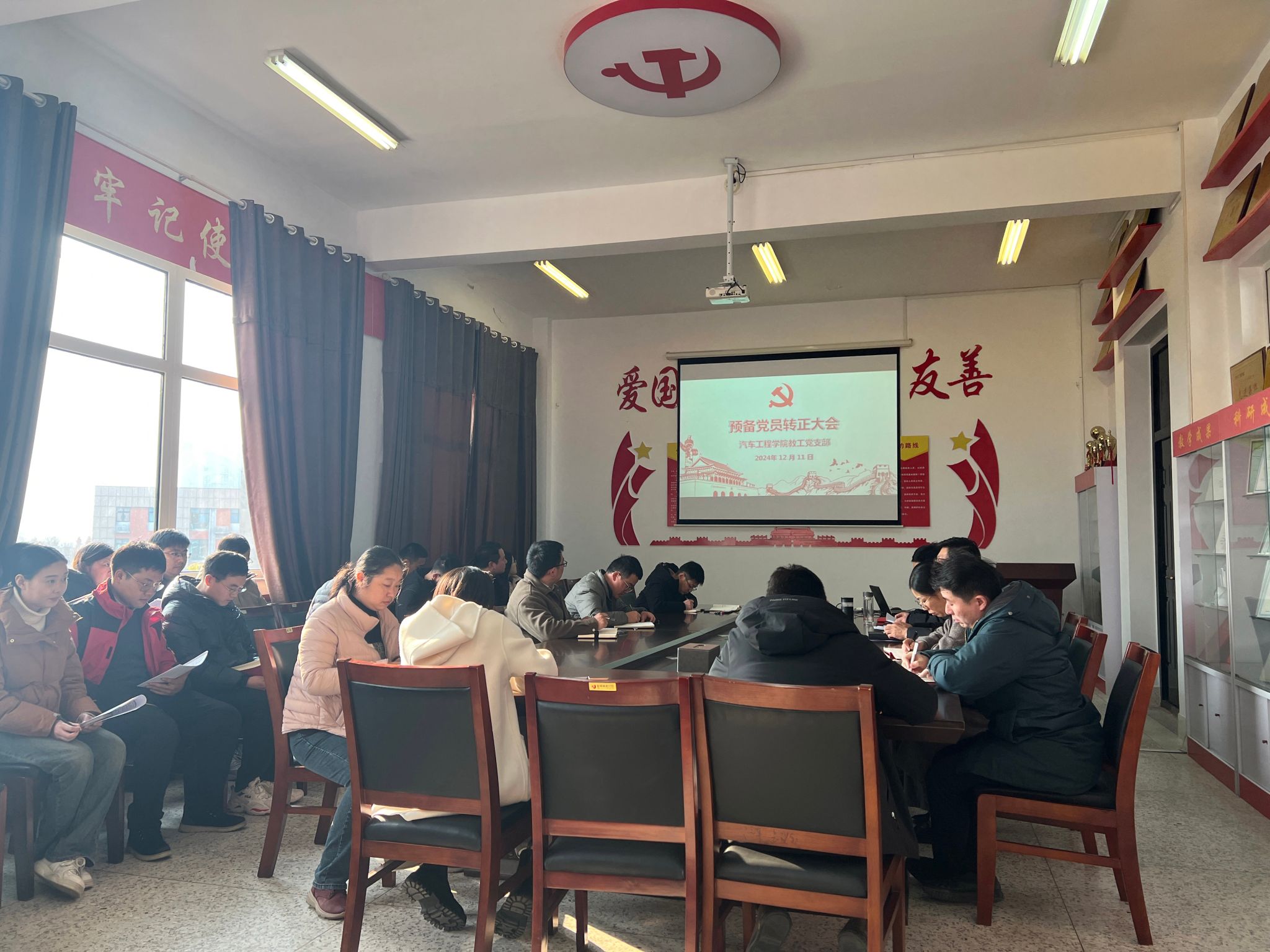 教工党支部于2024年12月11日在机械馆A323会议室召开党员大会,讨论预备党员陆俊同志的转正事宜,会议由支部书记熊新主持。