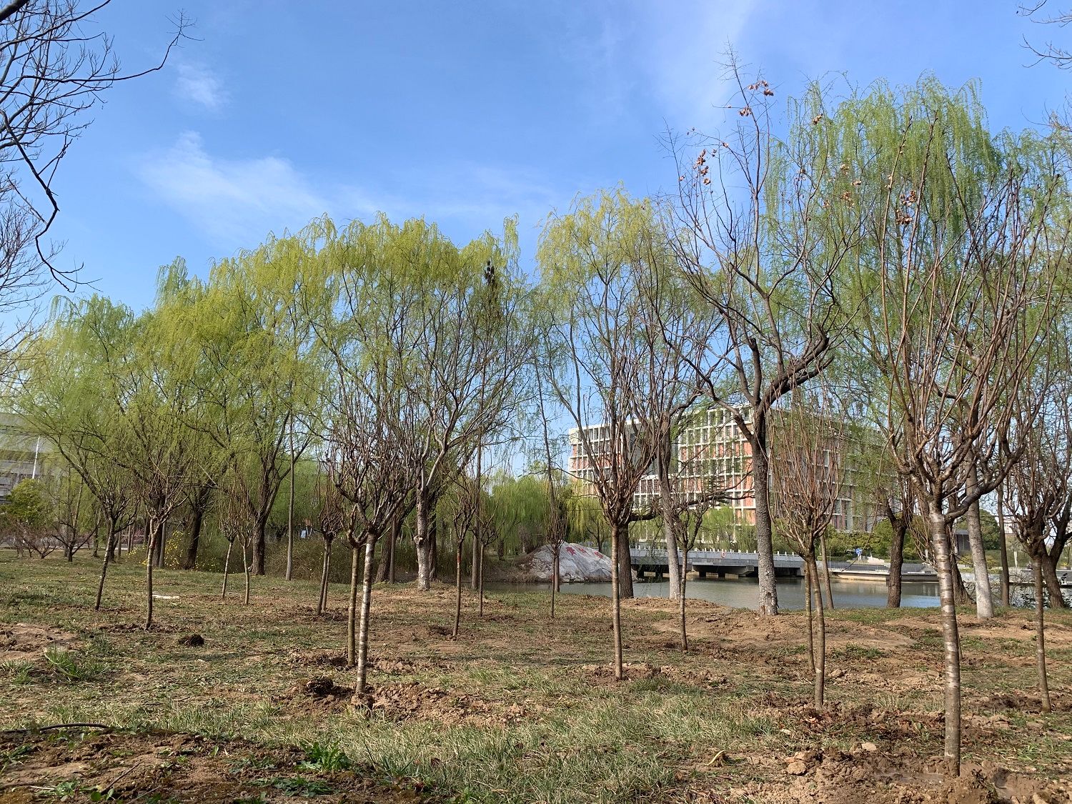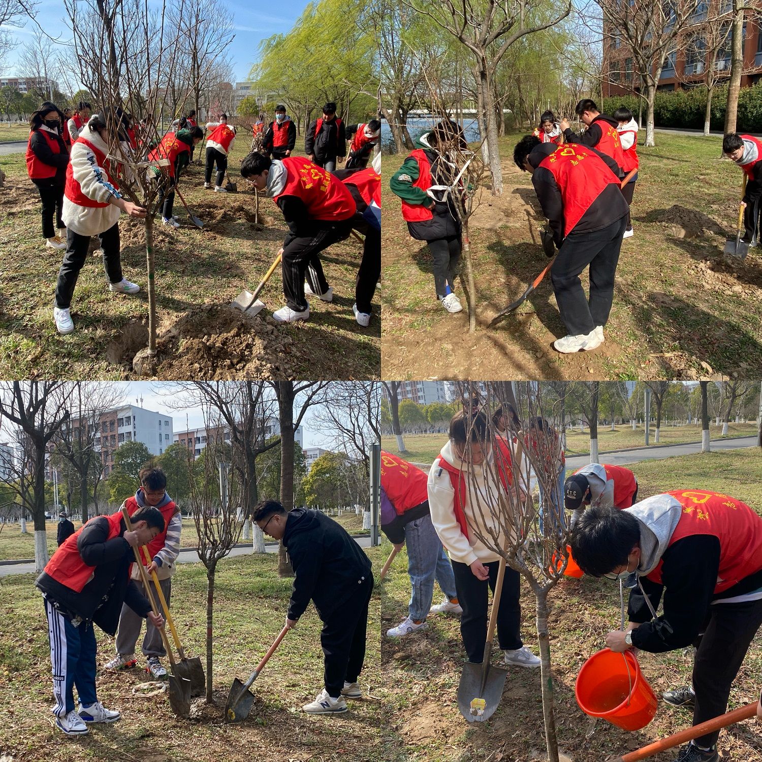 到达植树场地后,同学们两人一组在工作人员指引下领取了铁锹、水桶等植树用具,园艺工作者为大家演示了挖土、扶树、填土等过程中注意事项,同学们很快就撸起袖子热火朝天得干起来。流程逐渐熟悉后,小组内分工更加明确,植树效率也越来越高。经过一个多小时的劳动,二十株新栽的樱花树苗迎风而立,形成了一道整齐靓丽的风景线,为生机盎然的春天增添了新的希望。活动结束后,大家有序放回工具,看着亲手栽种的小树苗,期待它们茁壮成长。