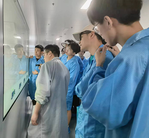 捷威动力技术部冷经理带领大家参观了电芯生产线,为大家详细讲解了电池的生产工艺和制作过程以及新能源领域的未来发展趋势,同时耐心解答同学们现场提出的问题。同行党员老师和冷经理就教科研中电池相关问题进行了深入探讨和交流,冷经理并现场就电池模组进行了讲解和解答。
