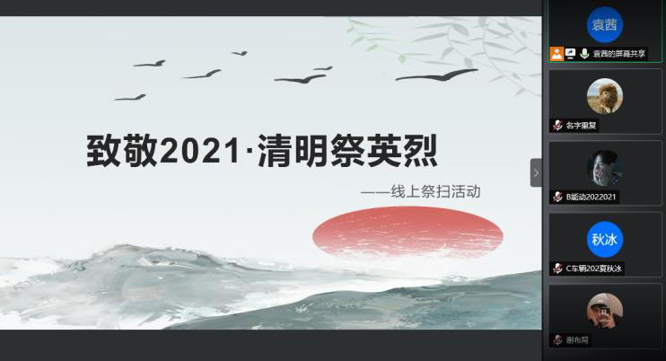 4月4日正值清明汽车工程公司团委通过腾讯会议开展以“致敬2021·清明祭英烈”为主题的线上祭扫活动。团员青年积极参与,纷纷留言。车辆181秦钰波感慨道:历史长河悠悠,但先烈们的英雄事迹和革命精神应该被世代相传,幸福的生活来之不易,我们当代老员工应争做新时代文明实践红色基因的践行者,为建设和谐社会贡献自己的青春力量。
