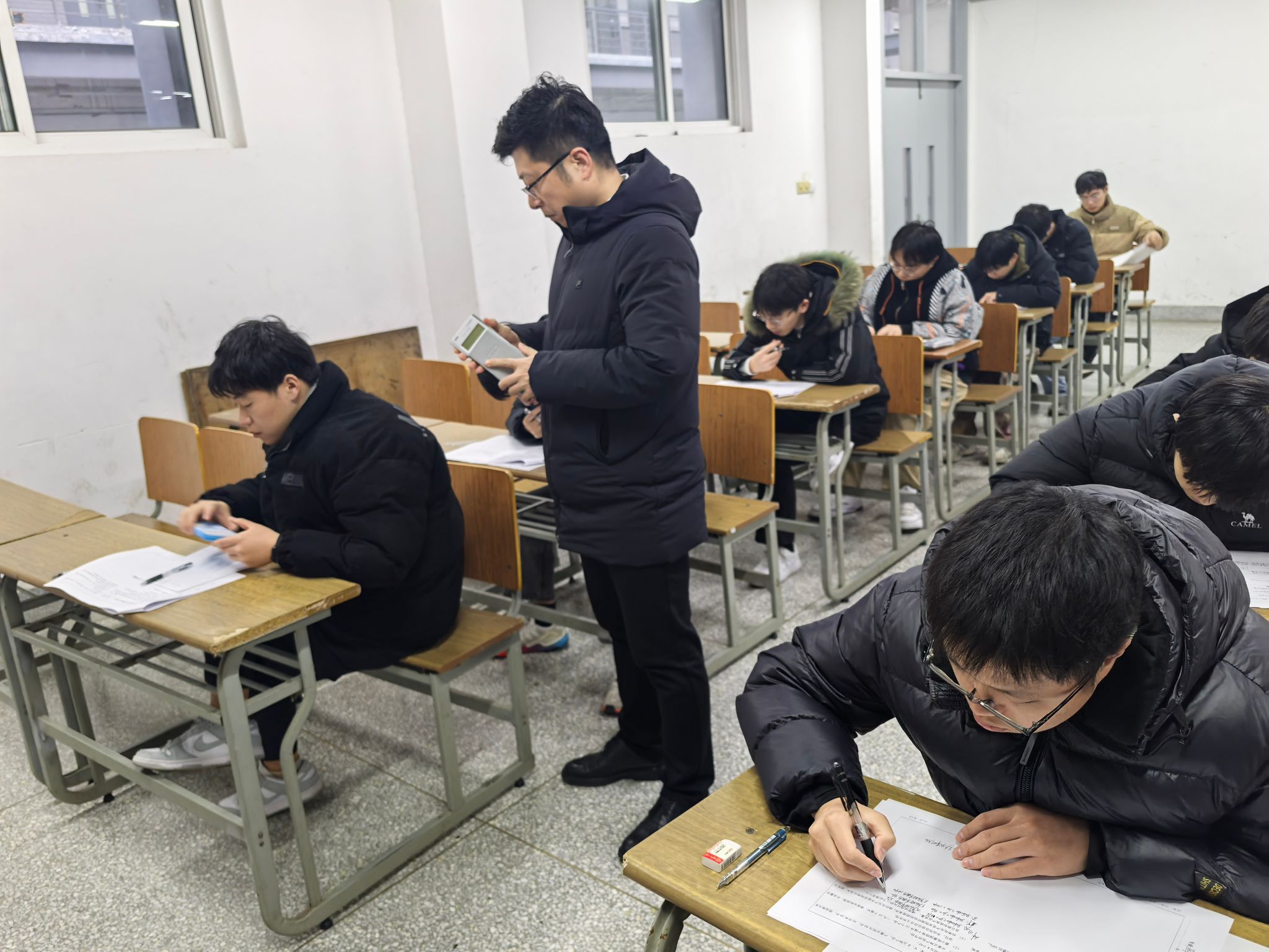 监考中,熊新把控全场,郑竹安检查员工证件、改正带、计算器壳、尺子、笔袋内有无纸张等。之后两位老师在考场内不断走动巡视,考场内氛围严肃。
