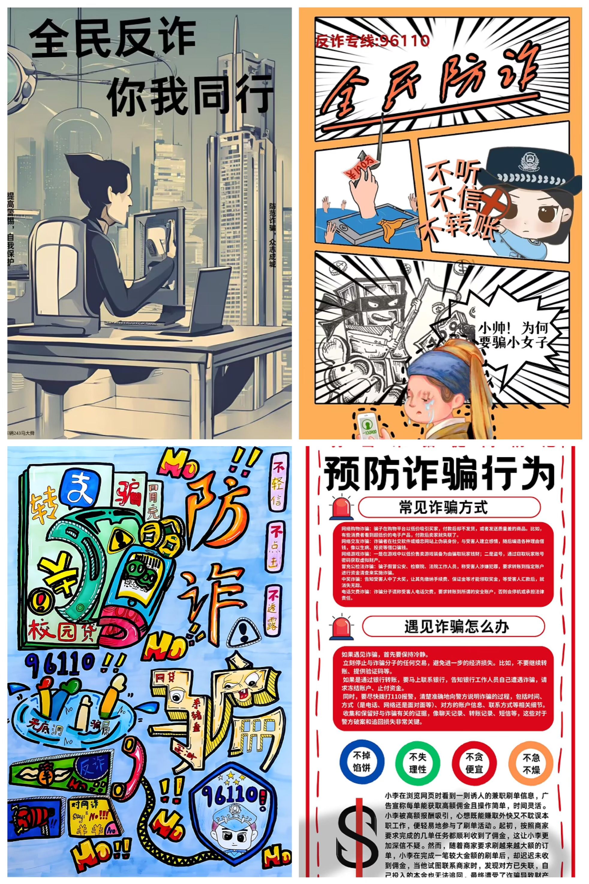 活动启动以来,同学们的参与积极性非常高,结合身边的受骗案例,创作出一幅幅既富有创意又寓意深刻的反诈海报。参赛作品内容丰富、形式多样,有以漫画形式生动描绘诈骗分子的惯用伎俩,有简洁鲜明的色彩和标语宣传反诈知识,提醒同学们时刻保持警惕、增强防诈能力。反诈海报凝聚了同学们的智慧和心血,展现了他们对反诈知识的深刻理解,体现了他们对构建安全校园环境的积极作为。