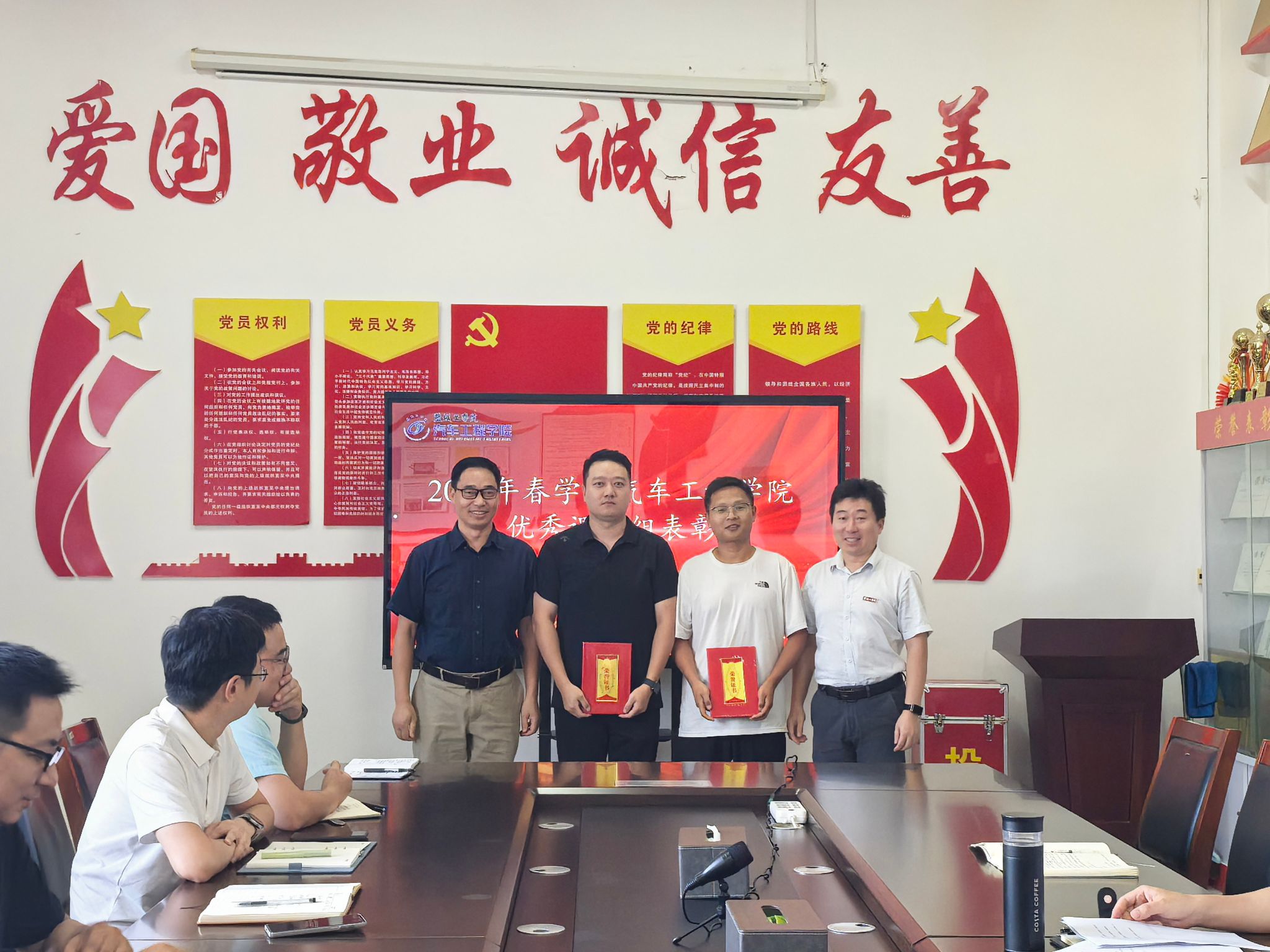 在表彰环节,经理刘玮从课程总评、员工评教、督导听课、教学材料检查四个维度,分别给出表现较好的课程组进行综合考核。最终公司决定对制图课程组和试验课程组进行表彰,副经理熊新与郑竹安为获得2025年春学期优秀课程组进行颁奖。