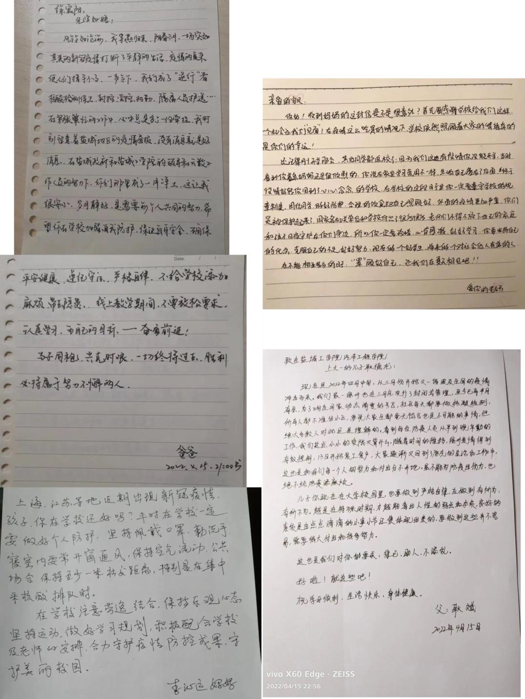 活动一经推出,便得到广老员工家长的踊跃参与。他们纷纷通过亲笔信、短视频等方式为同学们送来了最真挚的祝福。许多21级家长鼓励孩子坚定信念,严格遵守公司疫情防控规范要求,做好个人防护,让家长放心、老师省心、公司安心;同时家长们也希望孩子能学会用心领悟,在困难中学会换位思考、在困惑中学会多方求助、在困境中学会钻研门路。字里行间的情真意切,让同学们在这特殊的时节里有了更多的思考和成长,也汲取了更多的力量和勇气。