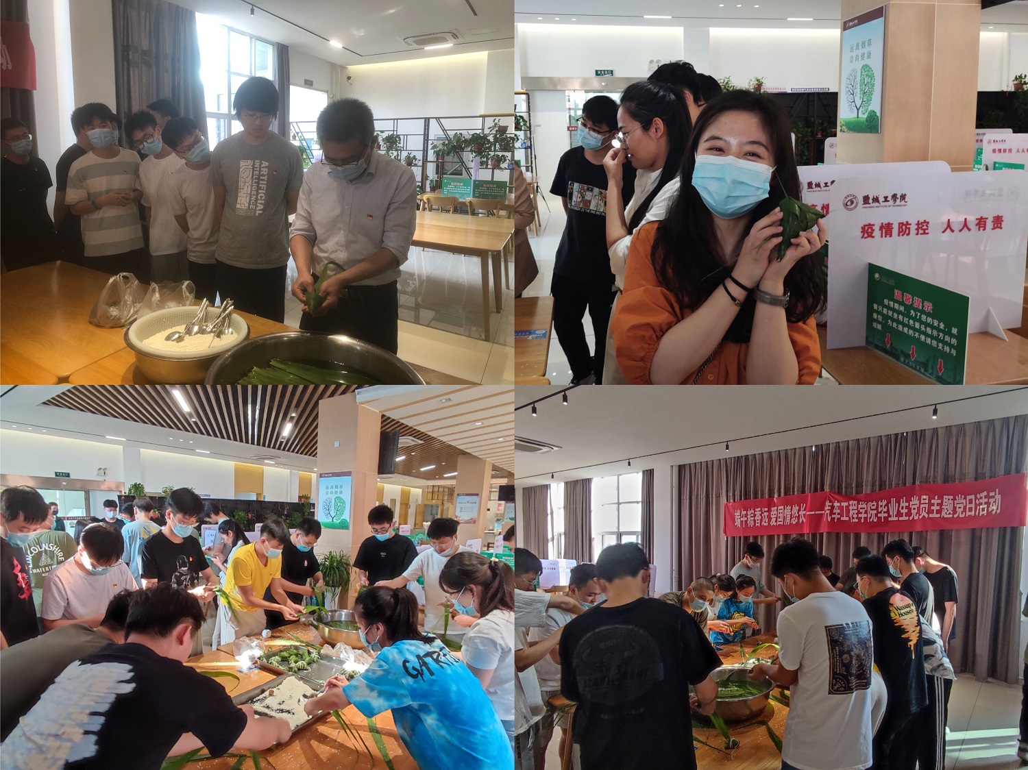座谈会后,全体毕业生党员前往公司教职工餐厅。大厅里,提前准备好的粽叶、糯米、红枣、红豆、绳子等必备材料已经摆上桌,还特别邀请了有经验的同志现场教授包粽子。党员们手拿粽叶,认真地学习着,不一会,一个个有棱有角的粽子就成型了。师生们一边包粽子,一边聊着端午习俗,时而交流经验、相互探讨,时而团结协作、共包粽子,大家兴奋地展示着自己的“第一个作品”。活动中,现场一片欢声笑语,当一只只形态各异的粽子包好摆放在一起的时候,大家感受到了劳动收获的喜悦、温馨浓厚的节日氛围、中国传统文化的乐趣,同时,促进了师生间的交流,增进了彼此情谊。