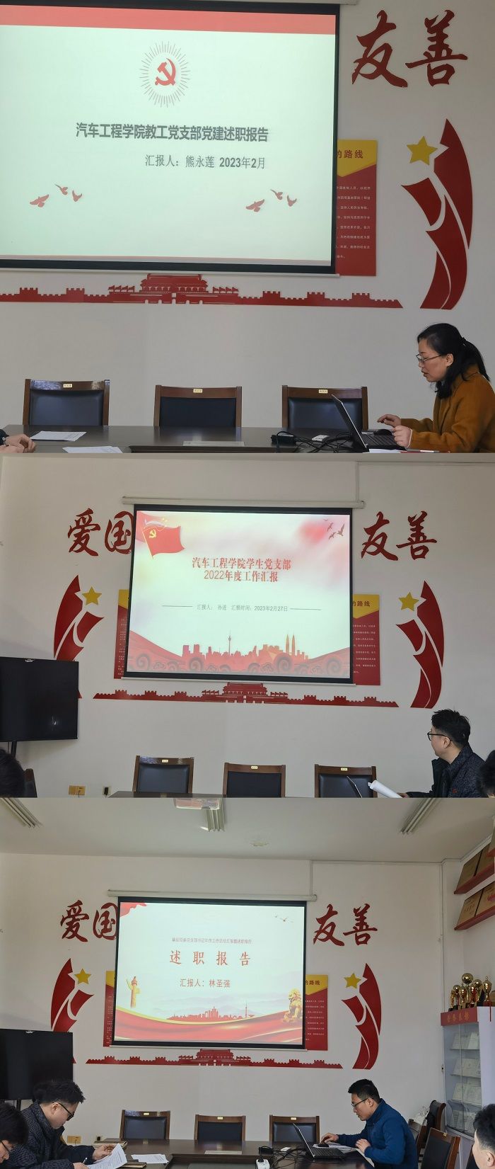 教工党支部书记熊永莲、员工党支部书记孙进、研究生党支部书记林圣强围绕履行党建基层工作责任情况、认真学习宣传贯彻党的二十大精神情况、党员教育常态化制度化情况、工作不足和整改措施等方面作工作汇报。由公司科级以上干部现场测评。